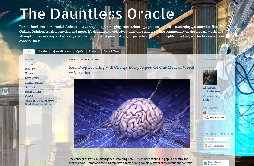 Recently, former student Austin Anderson e-mailed me to say hello, and to let me know about a new blog he started, called The Dauntless Oracle. On it, he writes about a range of topics, but all of them seem to be around the intersection of technology and culture. Those of you who are writing about those might want to go check it out. Nice work, Austin!